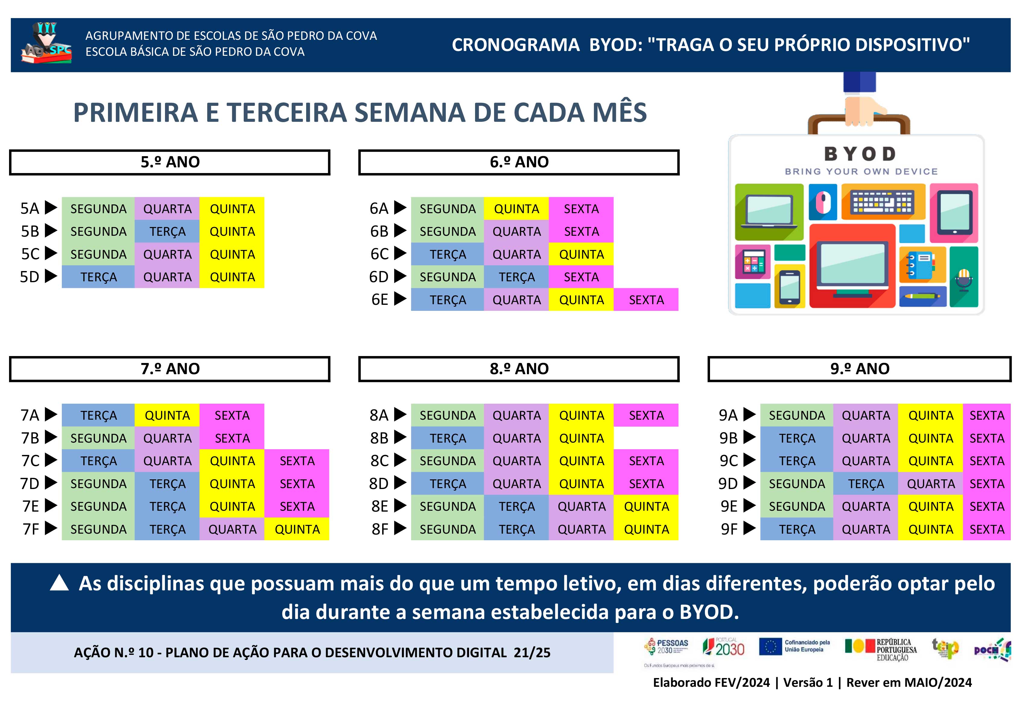 Já se encontra disponível, para consulta, o regulamento da Ação n.º 10 "BYOD - Bring Your Own Device", delineada no Plano de Ação e Desenvolvimento Digital da Escola, bem como o cronograma para a sua implementação (a iniciar no dia 4 de março de 2024).